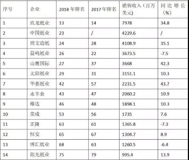 而在全球百强榜中,中国有14家企业上榜。第一次上榜的中国纸业排名第23位,营业收入4229.6百万美元,理文造纸、晨鸣纸业(6.010, -0.10,-1.64%)和山鹰国际位列第三到第五位。14家企业中有11家的营业收入同比都有所增长,其中华泰纸业、山鹰国际、理文造纸和玖龙纸业的营收增速都超过了30%,而晨鸣纸业、正隆纸业和博汇纸业(15.630,-0.04, -0.26%)的营收同比有所下降。