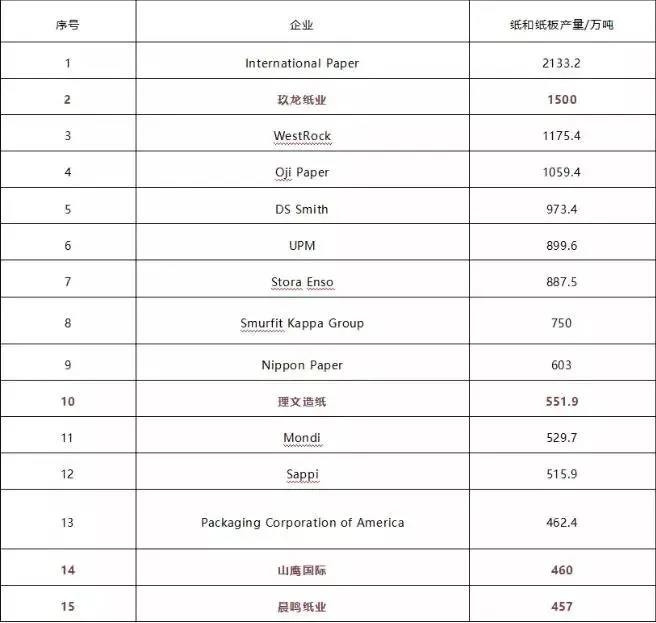 此外,如果按照产能来排位,全球33家纸及纸板产量超过200万吨的造纸企业名单中,国际纸业排名第一,玖龙纸业和WestRock位列二、三位。有四家中国企业产量进入全球产量前15强,分别是玖龙纸业、理文造纸、晨鸣纸业和山鹰国际。