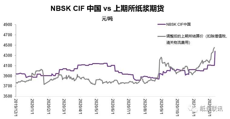 NBSK CIF价格的上涨主要是由于本周上期所2021年1-3月纸浆期货合约价格飙升,从而带来了期现套利空间。12月11日,合约SP2101、SP2102和SP2103的结算价分别为5,114元/吨、5,150元/吨和5,196元/吨,扣除增值税和物流成本后分别约675美元/吨、680美元/吨和686.5美元/吨。